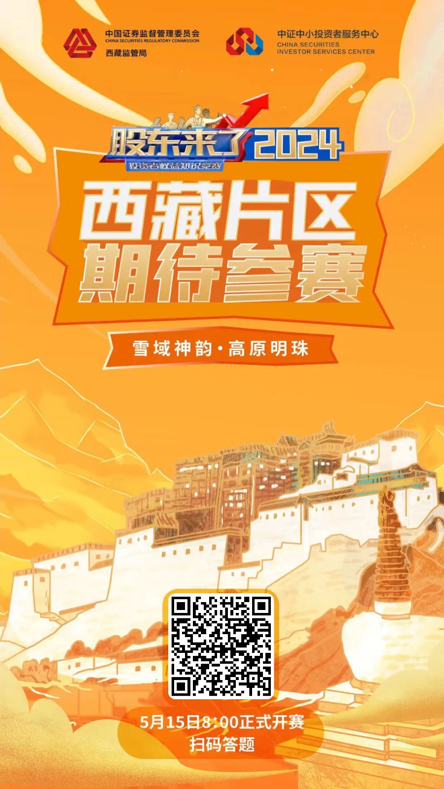 由中證中小投資者服務(wù)中心主辦,上海、江蘇、西藏、深圳證監(jiān)局聯(lián)辦的《股東來(lái)了》-2024投資者權(quán)益保護(hù)知識(shí)競(jìng)賽活動(dòng)于5月15日正式啟動(dòng)。本次活動(dòng)采用網(wǎng)絡(luò)答題方式,分設(shè)上海、江蘇、西藏、深圳四大片區(qū),掃描下圖二維碼即可參與“西藏賽區(qū)”答題活動(dòng),請(qǐng)全體同仁踴躍注冊(cè)并積極參與。